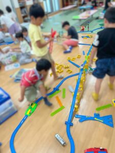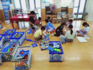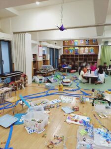 お留守番の1・2年生は今年も学童の部屋いっぱいにまちをつくることにしました。